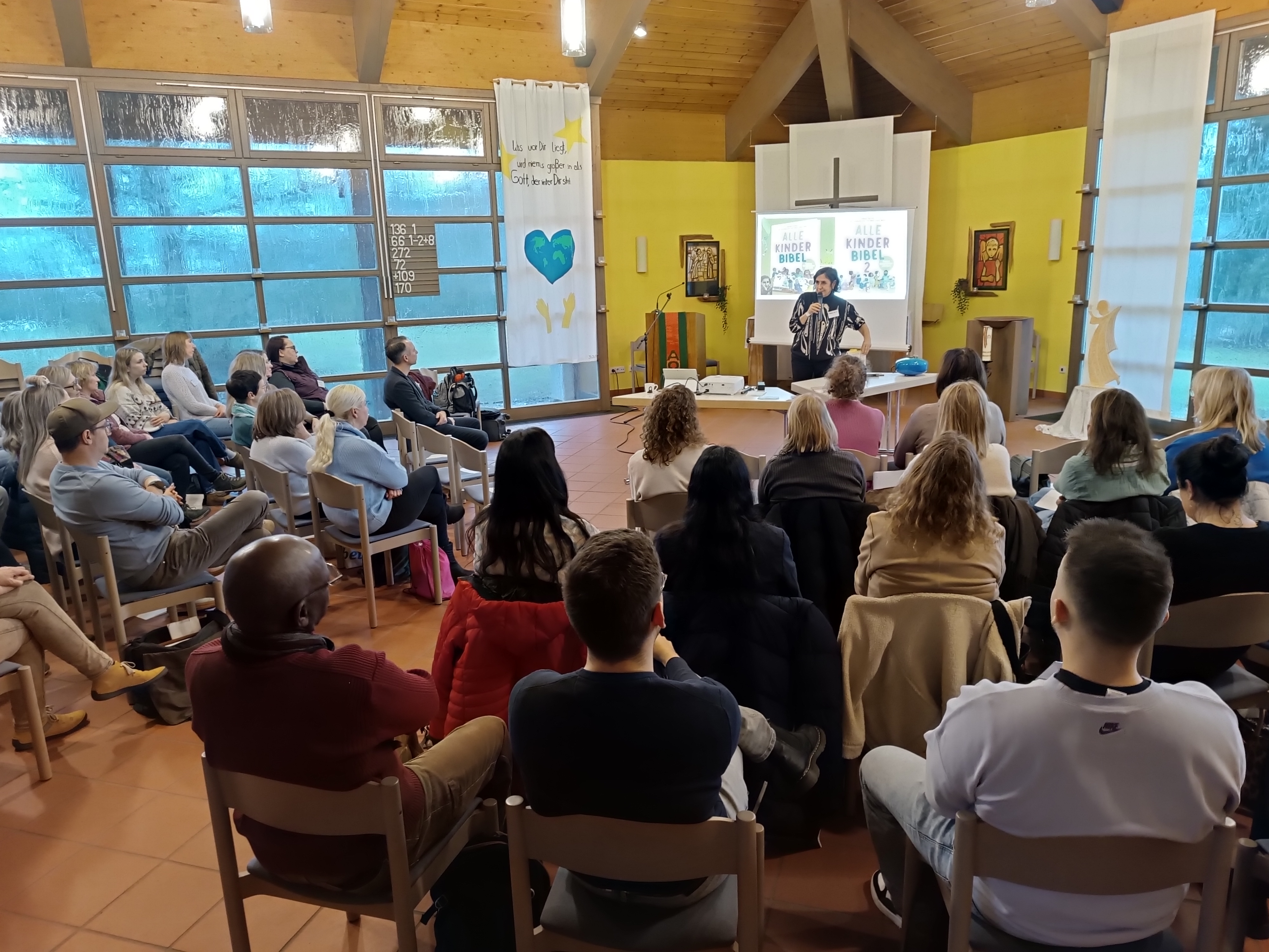 An dem Vormittag wurde auf anschauliche Weise deutlich, was die Alle-Kinder-Bibel besonders macht. In der neuen Bibelausgabe für Kinder geht es um Vielfaltssensibilität. So werden Mehrsprachigkeit und Mehrkulturalität als etwas Normales betrachtet. Kernwörter aus den einzelnen biblischen Geschichten sind in verschiedenen Sprachen in die farbenfrohen Bilder eingeschrieben. Ihre Leidenschaft, Wörter in verschiedenen Sprachen zu sammeln, vermittelte die Autorin mit großer Überzeugungskraft. Sie redete von den Sprachen, die nach Deutschland eingewandert und in unseren Kindertagesstätten ganz selbstverständlich zu hören sind. Auf ihrer Website schreibt sie: „Aufgewachsen bin ich in Kassel, in unserer Wohnung klang es geheimnisvoll nach Wörtern und Sprachen. Da war das Libanesisch meines Vaters, das Nordhessisch meiner Großmutter, das Französisch von Freunden. Der Gesang meiner Mutter und Tanten. Mein Vater sprach ein Deutsch voller Bild/Wunder mit mir, und deshalb vielleicht sind Deutsch und Poetisch meine Elternsprachen.“ Dass die Referentin mit Wörtern zu spielen und umzugehen weiß, zeigt die Wortschöpfung, die in der zweiten Geschichte der Fortbildung im Mittelpunkt stand. Die Erzählung „Jesus und die Kinder“ mündete in den Satz: „Gott liebt alle Kinder, das ist doch wunderklar!“